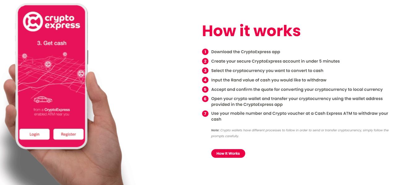 ユーザーはアプリを通じてCryptoExpressによって生成された出金バウチャーPINを受け取り、受け取ったPINと携帯電話番号をCash Express ATMに入力することで、現金を受け取ることができる。現在、ビットコイン、イーサリアム、USDコイン、テザーでキャッシュアウトを利用できる。